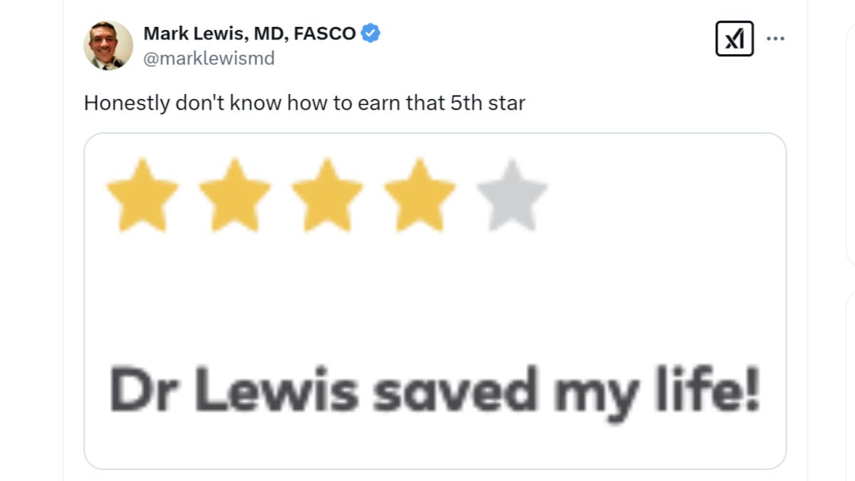 Dr. Mark Lewis, a Utah oncologist with a substantial social-media following, once earned a lot of laughs for sharing a patient review: "Dr Lewis saved my life! [4/5 stars]". His wry rejoinder? "Honestly don't know how to earn that 5th star".